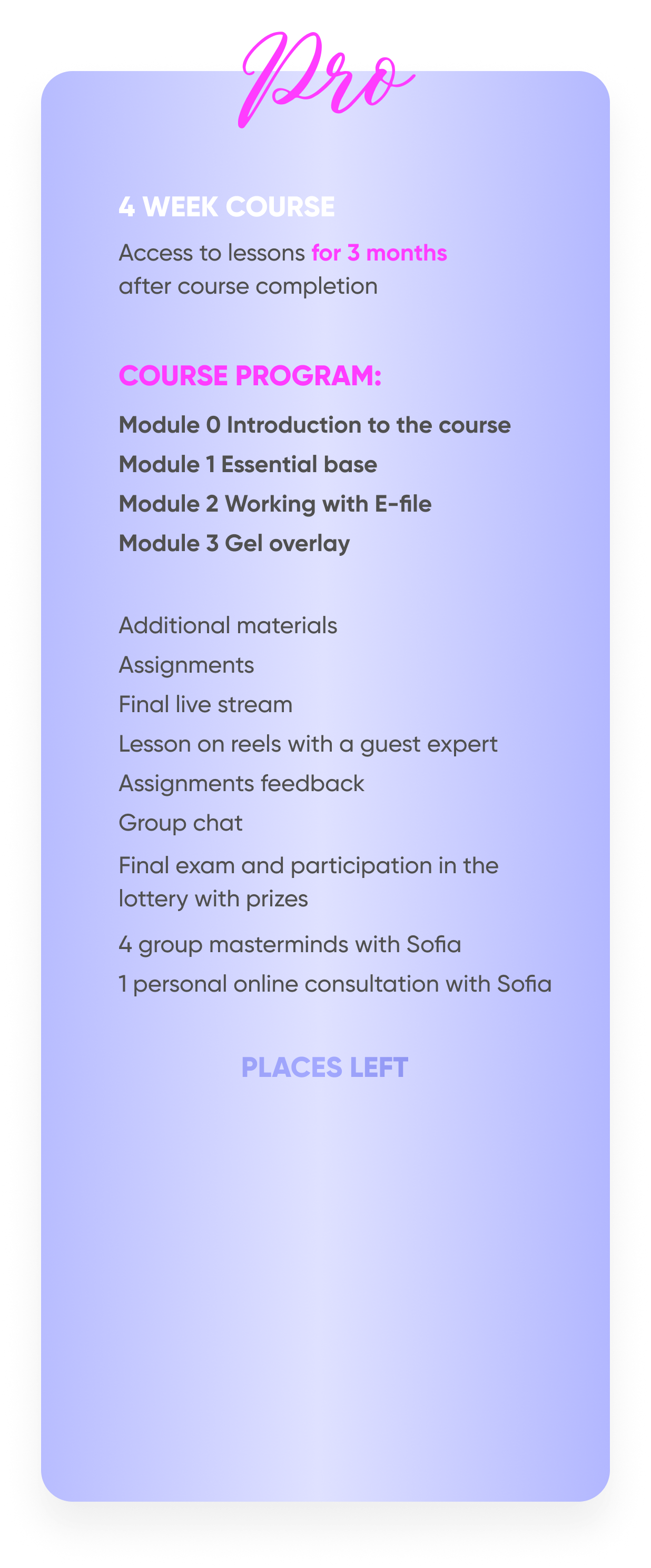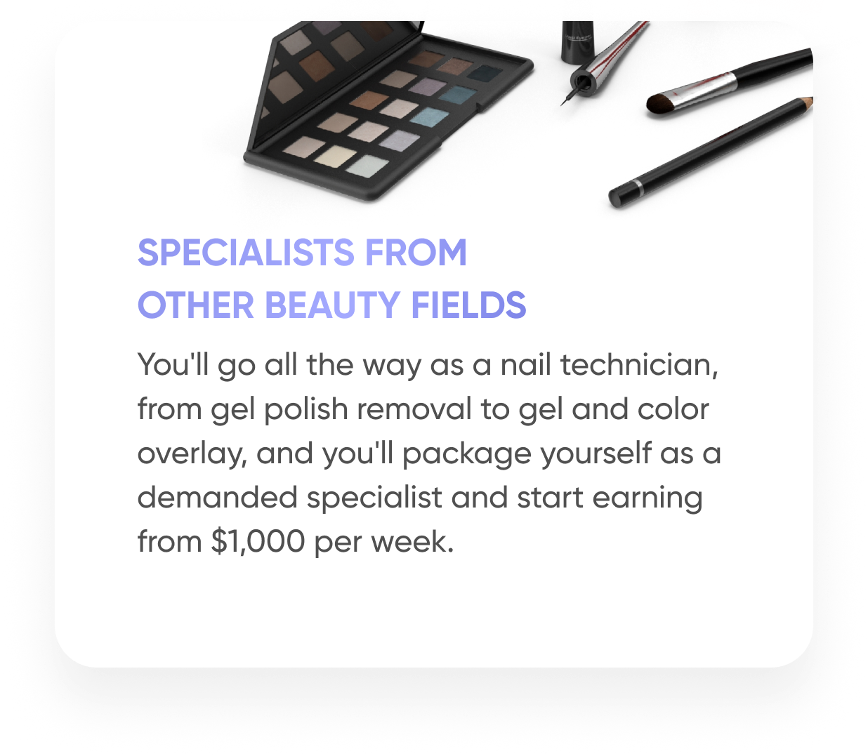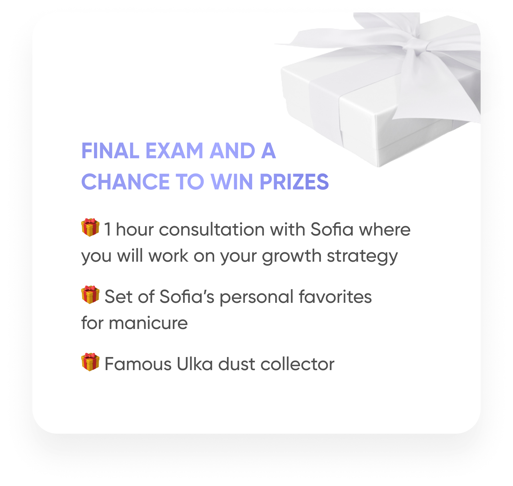 You'll do a professional manicure according to all the rules for the final exam. Learn how to apply gel overlay and color. Start promoting yourself and attracting clients through Instagram and other online and offline channels. You will sell your services and get more clients. You’ll introduce high quality service and increase your income.